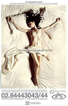 El 25 de noviembre de 2009, con ocasión de Día Mundial contra la Violencia hacia las Mujeres proclamado por la ONU, la organización Telefono Donna propone una campaña de sensibilización sobre el tema a través quinientos carteles fijados en la ciudad. En la foto del cartel, una mujer desnuda, semicubierta con una sábada, está tendida sobre una cama en posición de crucifixión. El objetivo de la campaña es sensibilizar a la opinión pública sobre la violencia de género y fomentar el hábito de la denuncia de sus agresores en las mujeres que sufren violencia.