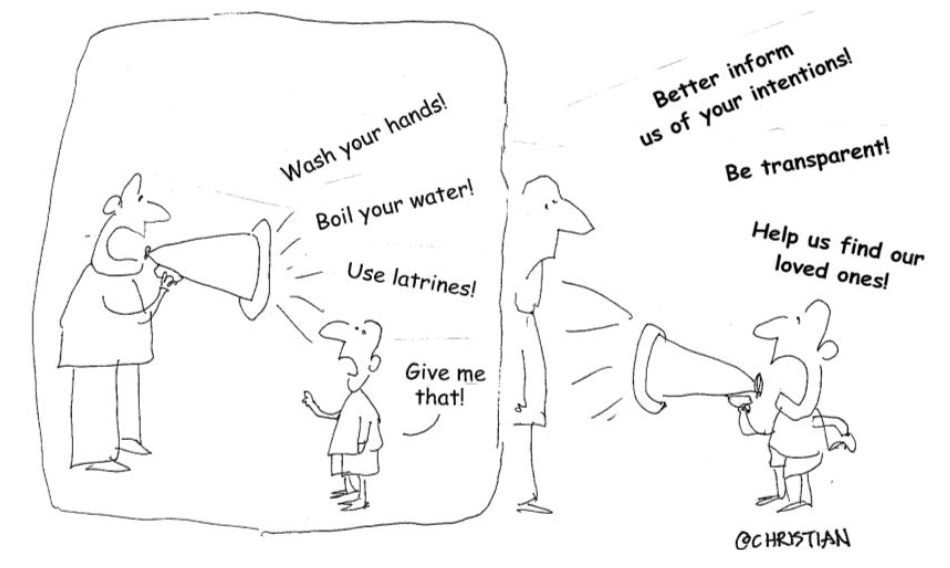 La comunicación es proceso de doble vía; las estrategias efectivas de CwC facilitan el dialogo entre los afectados o sobrevivientes y los responsables de la ayuda humanitaria, tanto a nivel local, como internacional.